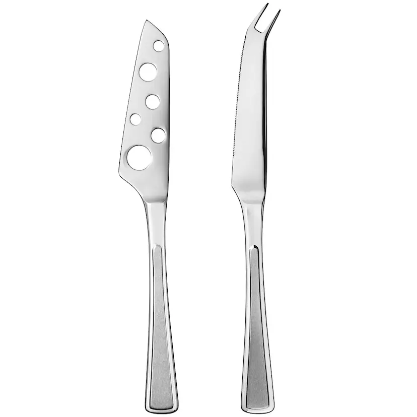 Ostsetet i den älskade och ikoniska Ramona-serien från Hardanger Bestikk är perfekt för ostälskaren. Besticket, med sina borstade ytor och raka kanter, balanserar enkelhet med dekorativ design. Setet består av två ostknivar: en bred kniv med hål för att förhindra att mjuka ostar fastnar, samt en smalare kniv för hårdare ostar. Den smala kniven har också två spetsar som kan användas som gaffel tillsammans med den breda kniven. Tillverkat av 18/10 rostfritt stål, tål det diskmaskin och har livstidsgaranti. Ostsetet levereras i en presentförpackning och inkluderar följande: