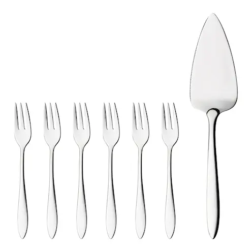 Kakset för 6 personer från Hardanger Bestikks serie Fjord. Bestickserien, som är en av Hardangers mest populära, är formgiven av Odd Leikvoll och blandar stilfullt mjuka och hårda linjer. Komplettera gärna med resterande delar ur Fjord-serien.