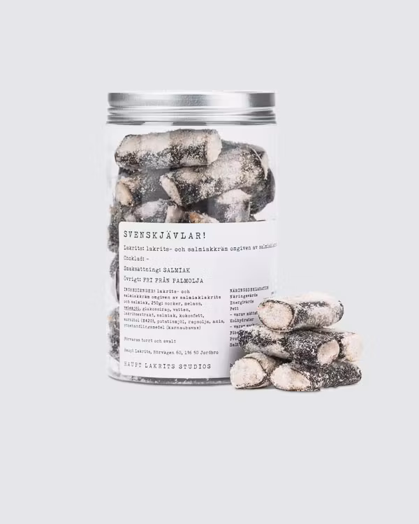 Lakrits- och salmiakkräm omgiven av salmiaklakrits och salmiak.