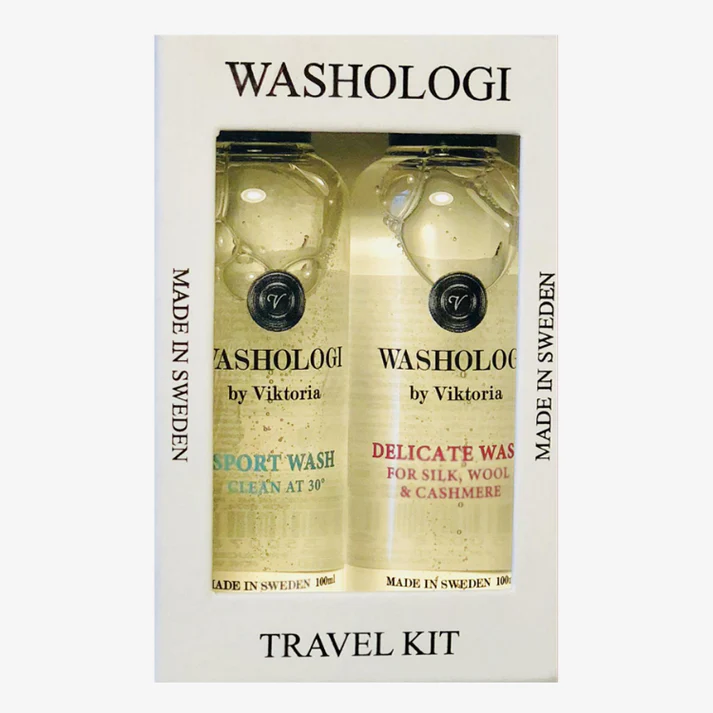 WASHOLOGIs Travel Kit innehåller två flaskor om 100 ml, Sport Wash och Delicate Wash. Perfekt att ha med sig under resan för att behandla smutsiga kläder. Fungerar både i tvättmaskin och för hand. Enzymfria Sport Wash motverkar svettlukt redan vid 30 grader och enzymfria Delicate wash använder sitt silkesextrakt och lanolin för att skonsamt tvätta känsliga plagg. Våra tvättmedel är fria från blekmedel & färgämnen, biologiskt nedbrytbara och doseras med endast 30/40 ml per tvätt.
